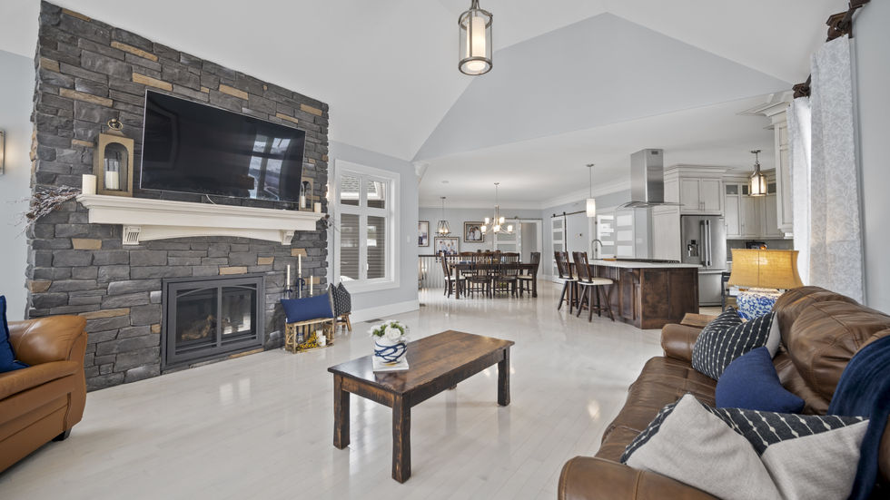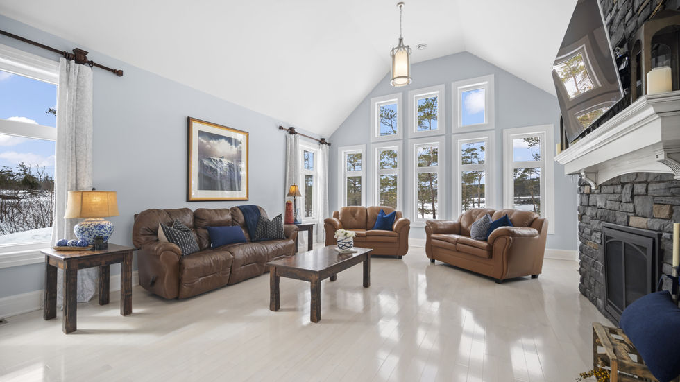 Embrace the epitome of luxury lakeside living in this executive waterfront home, nestled in the exclusive community of Northern Pines. With unobstructed 200 ft direct frontage of the serene Riverhead Long Pond, this home is a treasure trove of high-end amenities and bespoke charm. Awaiting you in this architectural marvel is the masterpiece of a living room, featuring up to 14-foot ceilings, with a majestic floor-to-ceiling propane fireplace with custom stonework and a wall of windows, offering panoramic views of the surrounding waterscape.